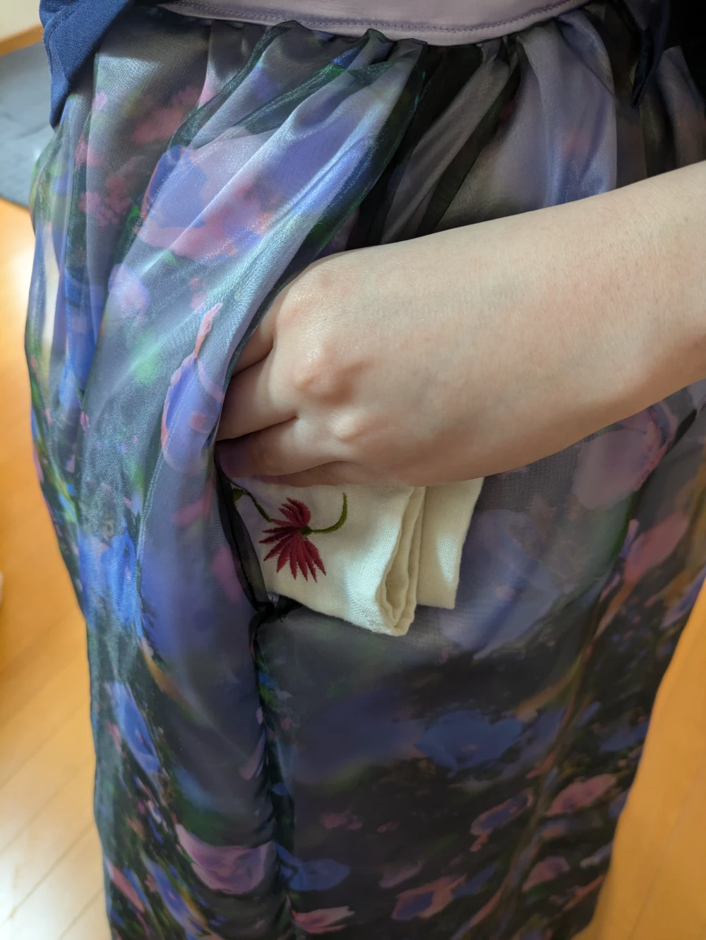 そのハプニングを知った母が、それ以降のすべてのドレスに施してくれたのが、左側の「隠しポケット」でした。客席側からは見えない場所に、そっとティッシュやハンカチ、冬場には手を温めるカイロを忍ばせられるように。